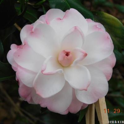 Cassia Wagner (C. japonica) Registered in 2025. ACS Registration #3393. It was originated and registered by Pat B. Johnson from Cairo, Georgia, USA. A 25-year-old Seedling of C. japonica 'China Doll'. It was first bloomed in 2018. Flower Formal double, white shading to coral on edges. medium size, 7.6 cm cm in diameter. Leaf Medium green, 8.9 cm long and 2,9 cm wide. Plant average growth rate, upright, open growth. Bloom early to mid-season.