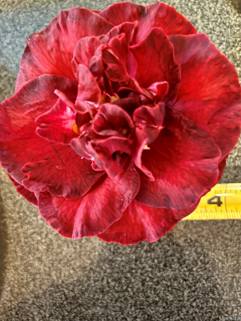 Dinh's Velvet (C. japonica) American Camellia Yearbook, 2023, p.87. Registered in 2023. ACS Registration #3342. It was originated and registered by Chuck Ritter from Melrose, Florida, USA. A 15-year-old seedling of C. japonica 'Royal Velvet'. It was first bloomed in 2015. Flower semidouble to loose peony form, burgundy with veining with yellow anthers and white filaments, medium size, 8.9-10.2 cm in diameter. Leaf dark green, 5.1cm long and 2.5-3.8 cm wide. Plant vigorous growth rate, upright, medium density growth. Bloom early to late.