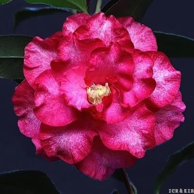 Frost on Fire (C. reticulata x C. japonica) Registered in 2025. ACS Registration #3380. It was originated and registered by Grant Montana from Midway, Georgia, USA. A 8-year-old Seedling of C. reticulata hybrid 'Frank Houser'. It was first bloomed in 2022. Flower Semidouble with wavy petals, raspberry red with highly speckled white frosting spread throughout the petals with butter yellow staments and white filaments. large size, 12.7 cm cm in diameter. Leaf Dark green, 15.2 cm long and 6.4 cm wide. Plant vigorous growth rate, upright, open growth. Bloom Mid-season to late.