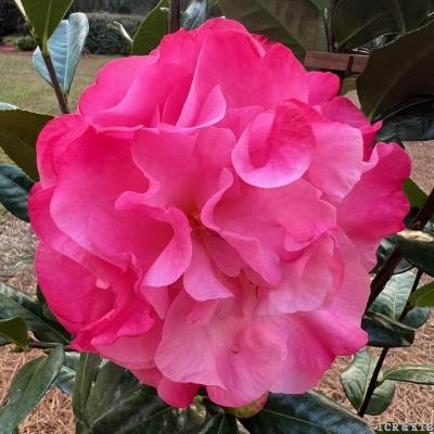 Nancy Hooper (C. reticulata x C. japonica) Registered in 2025. ACS Registration #3375. It was originated by John Wang from Orinda, California and registered by Randolph Maphis from Tallahassee, Florida, USA. A 13-year-old C. reticulata hybrid 'John's #3' x C. japonica 'Elaine's Betty'. It was first bloomed in 2017. Flower Semidouble to loose peony form to rose form double form, deep bright pink with yellow anthers and white filaments. medium to large size, 9.8 cm cm in diameter. Leaf Dark green, 10.2 cm long and 5.4 cm wide. Plant vigorous growth rate, upright, medium density growth. Bloom Mid-season to late.