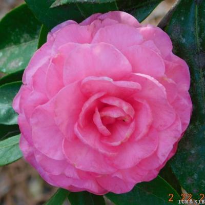 Sara Van Beck (C. reticulata x C. japonica) Registered in 2025. ACS Registration #3394. It was originated and registered by Pat B. Johnson from Cairo, Georgia, USA. A 40-year-old Seedling of Reticulata hybrid 'Frank Houser Variegated'. It was first bloomed in 2000. Flower Formal double form with slightly incurved petals, hot pink. miniature to small size, 5.7-6.7 cm cm in diameter. Leaf Dark green, 10.2 cm long and 3.2 cm wide. Plant vigorous growth rate, upright, open growth. Bloom early to mid-season.