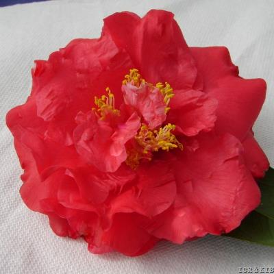 Tommy Alden (C. reticulata x C. japonica) Registered in 2025. ACS Registration #3386. It was originated and registered by Steve & Gayle Lawrence from Tallahassee, Florida, USA. A 10-year-old Seedling of Reticulata hybrid 'Delta Dawn'. It was first bloomed in 2016. Flower Semidouble, turkey red with gold anthers and white filaments. large size, 12.5 cm in diameter. Leaf Medium green, 10.8 cm long and 5.1 cm wide. Plant vigorous growth rate, bush. medium density growth. Bloom Mid-season to late.