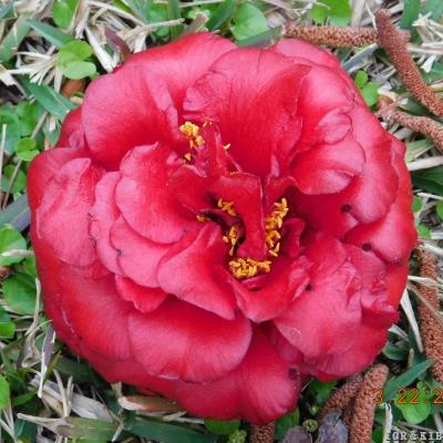 True Gris (C. japonica) Registered in 2025. ACS Registration #3391. It was originated and registered by Pat B. Johnson from Cairo, Georgia, USA. A 20-year-old Chance seedling. It was first bloomed in 2010. Flower Loose to full peony form, dark, shiny, brilliant red with yellow anthers and light red filaments. very large size, 7.6 cm cm in diameter. Leaf Dark green, 5.1 cm long and 3.8 cm wide. Plant average growth rate, spreading, open growth. Bloom Mid-season to late.